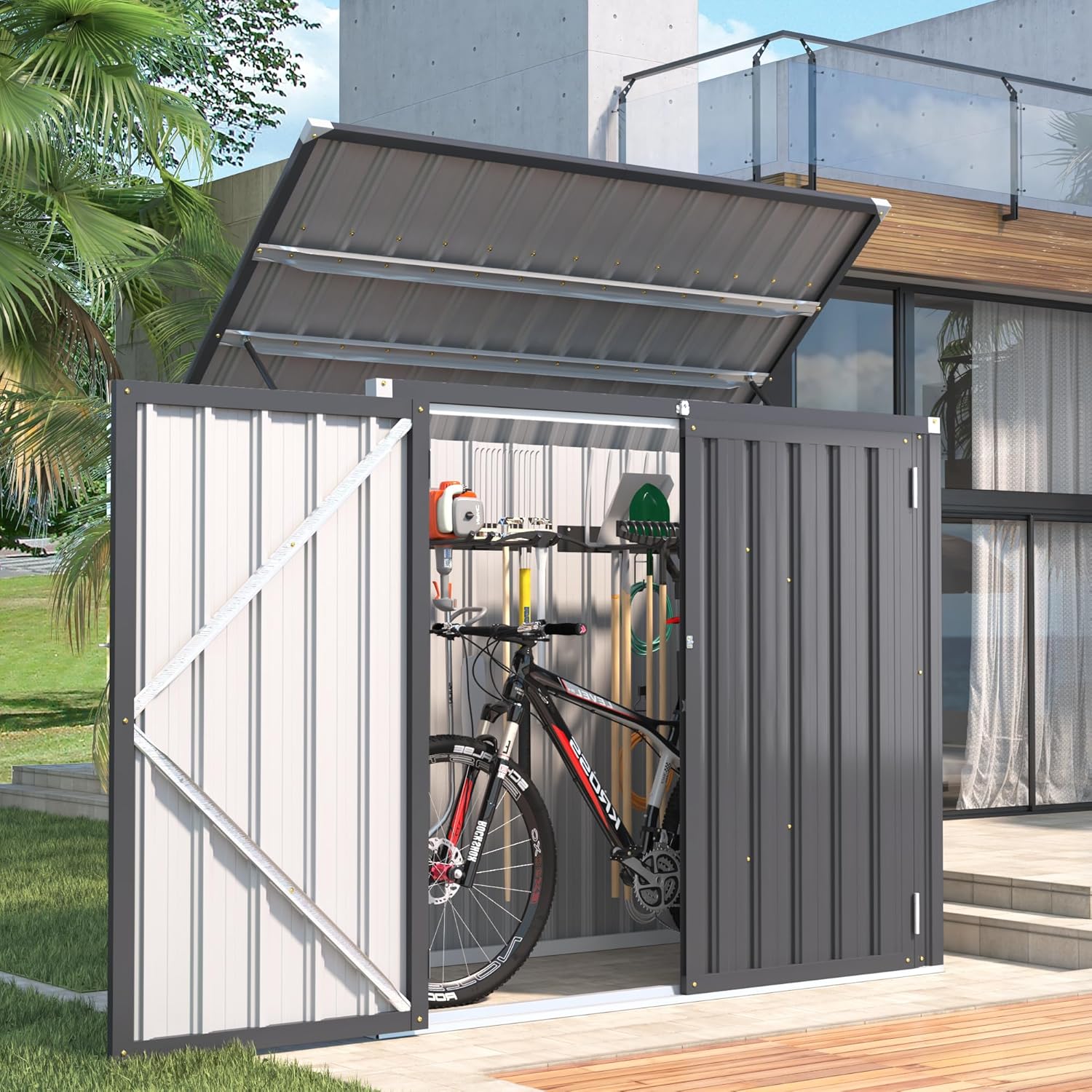 - Portability and Security: When used as an outdoor trash can storage, the design includes independent, upward-opening lid hooks that attach directly to the garbage can lid. A hydraulic mechanism ensures smooth opening and closing. Lockable double doors extend to 47 inches, allowing for the storage of longer items like bicycles and enhancing security, making it a versatile solution for both bike storage and outdoor storage.