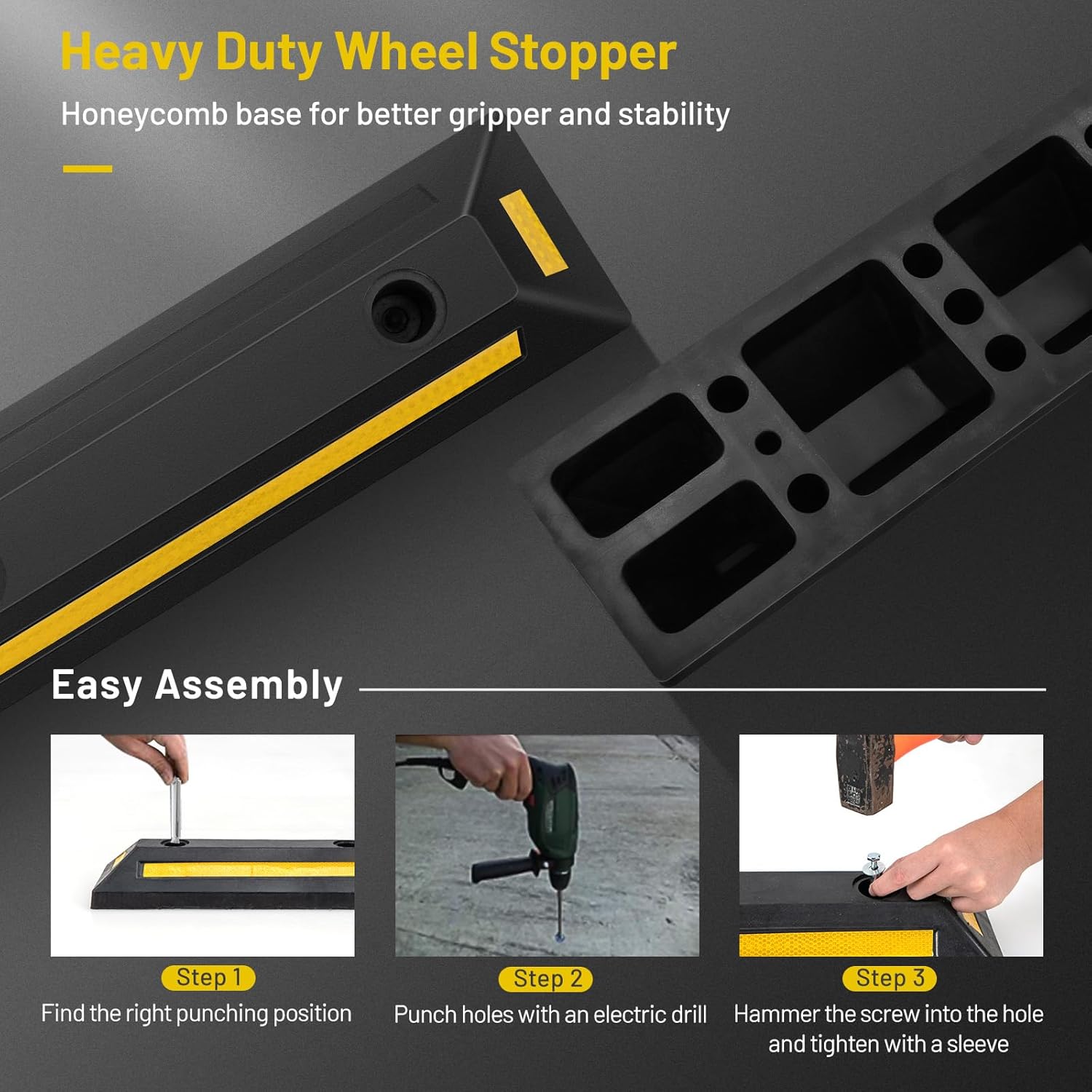 - Reliable Parking Curb: Effortlessly solve parking challenges with our heavy duty parking stopper. Designed to minimize collisions, scratches, and dents, the garage tire stops ensure safe vehicle protection.
