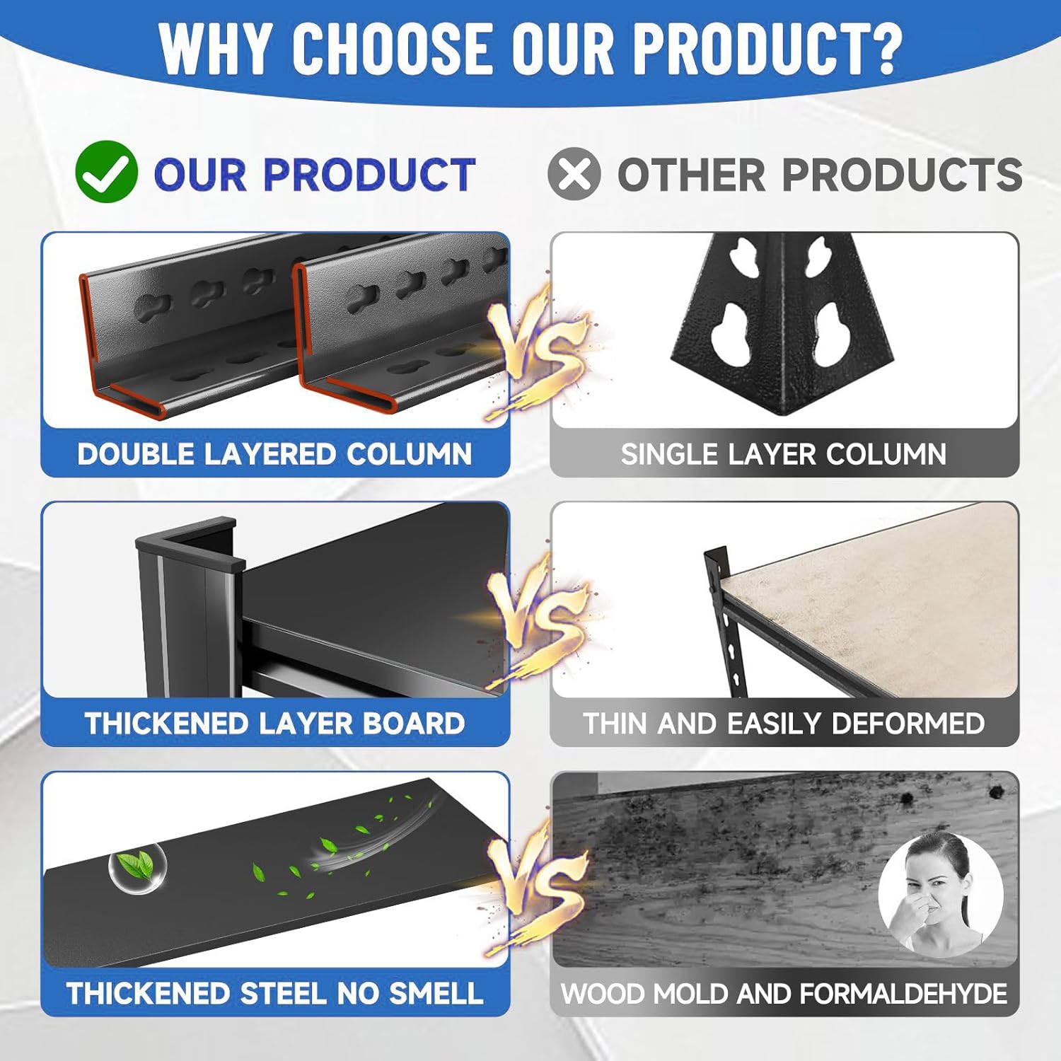- 【3500LBS Metal Storage shelves】This metal garage shelving is made of high-quality thickened cold-rolled steel, with a hardness increase of 30% compared to ordinary steel. The double-layer column design greatly improves the stability and load-bearing capacity of the storage shelves, with a comprehensive load-bearing capacity of up to 3800LBS and a load-bearing capacity of 700LBS per layer