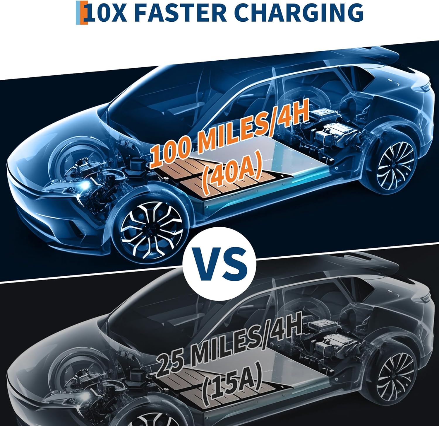 - Dual-Level Fast Charging- The ev charger level 2 supports Level 2(240V/NEMA 14-50) charging. Delivers 40A output for 40% faster charging (100 miles in 4 hours) compared to standard 15A chargers. Industrial-grade plug ensures stable high-power performance.
