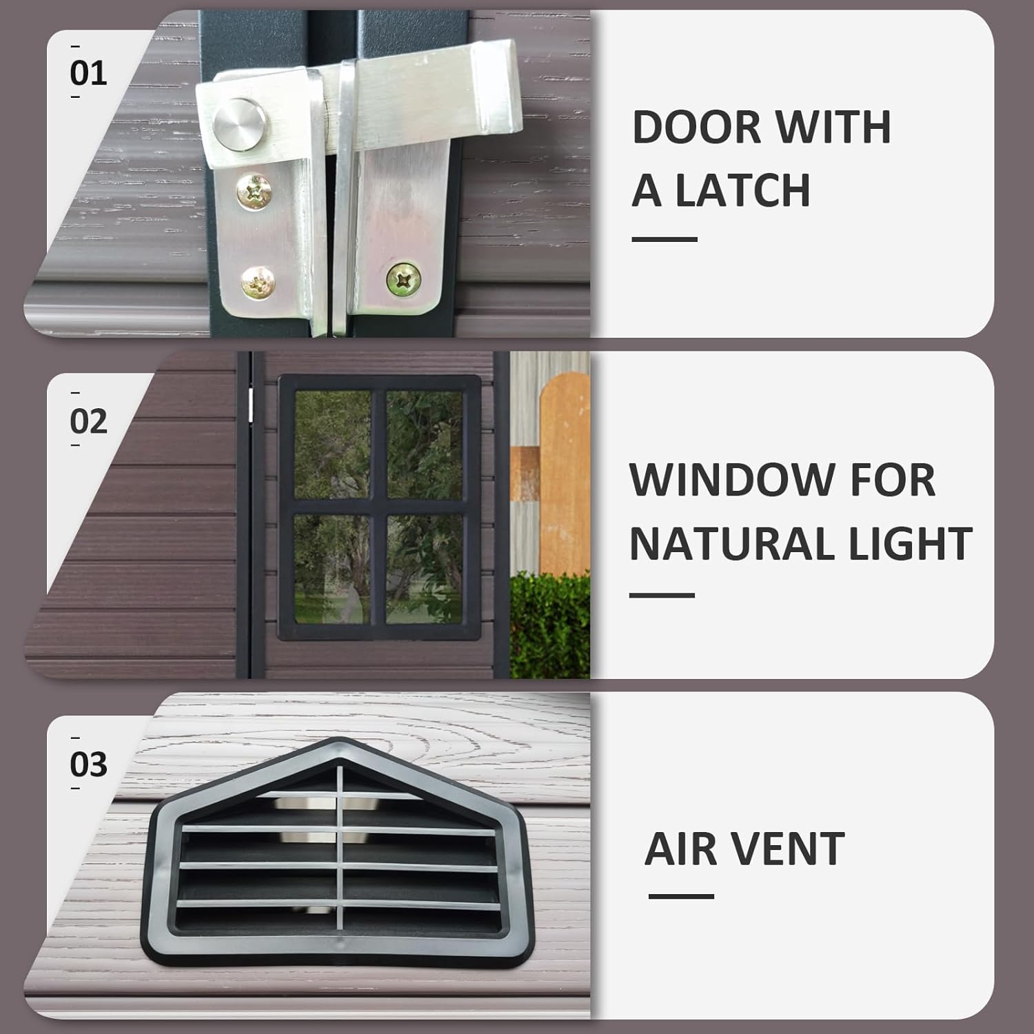 - đ ăIntegrated Vents & Clear WindowăDesigned for airflow and visibility, this garden shed features louvered vents above the door to enhance ventilation and reduce moisture buildup. A crystal-clear side window fills the interior with natural light, eliminating dark corners and making it easier to find your tools and supplies