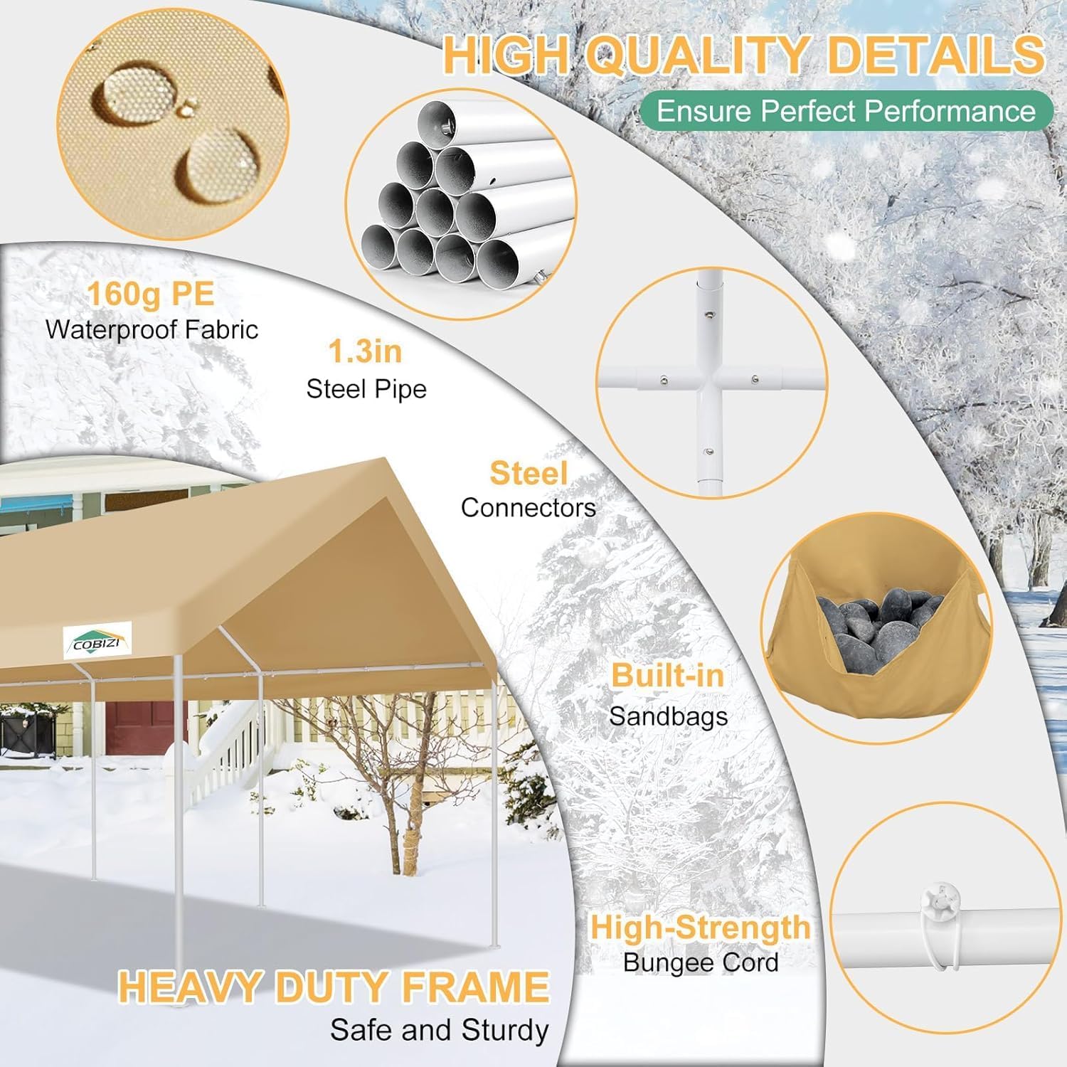 COBIZI Carport 12x20ft Heavy Duty Portable Garage, 2.0 Powder Coated Frame(Better Than Galvanized), Waterproof Shelter with Removable Sidewalls & Windows, Built-in Sandbags, for Car/Boat/SUV, Khaki