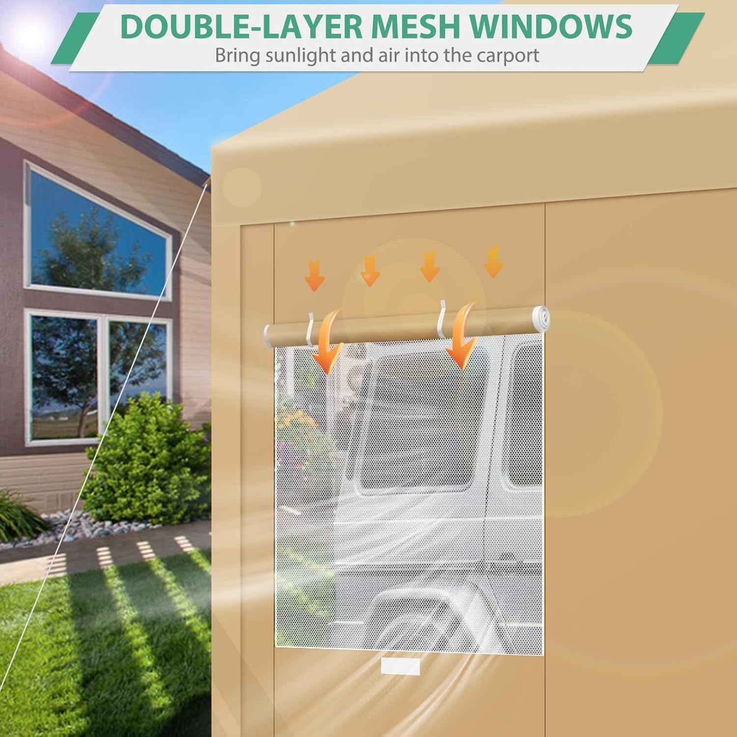 - 【Good Ventilation】 Our portable garage is equipped with four roller shutter mesh windows and two zippered doors on two side walls, which enhance airflow, reduce moisture accumulation, and create a comfortable internal environment.