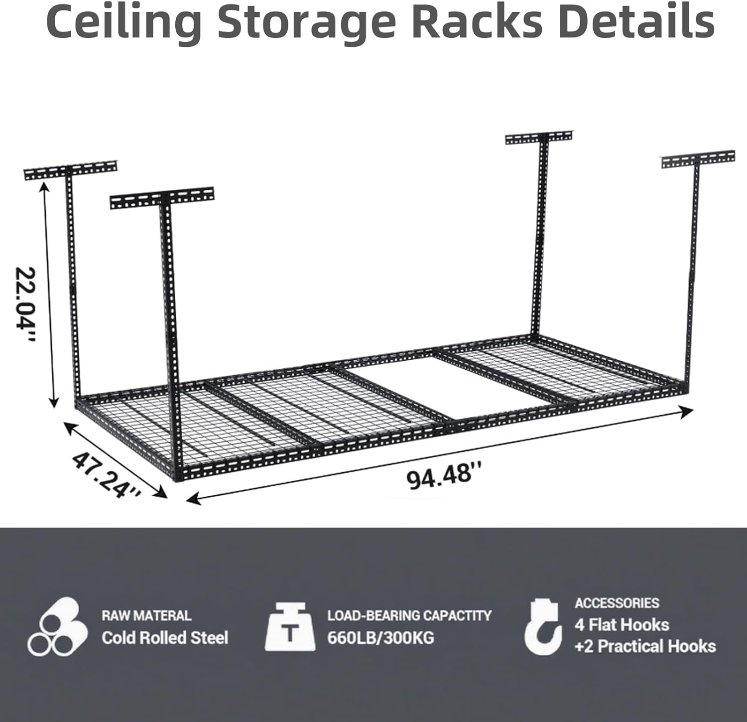 - Industrial-Grade Strength: This garage ceiling storage rack is built with cold-rolled steel & reinforced bars to safely hold 330lbs (evenly distributed with included wooden boards). Ideal for tires, toolboxes, bins, and seasonal gear, its thick M8 bolts and extra mounting holes ensure rock-solid stabilityâno shaking or sagging!
