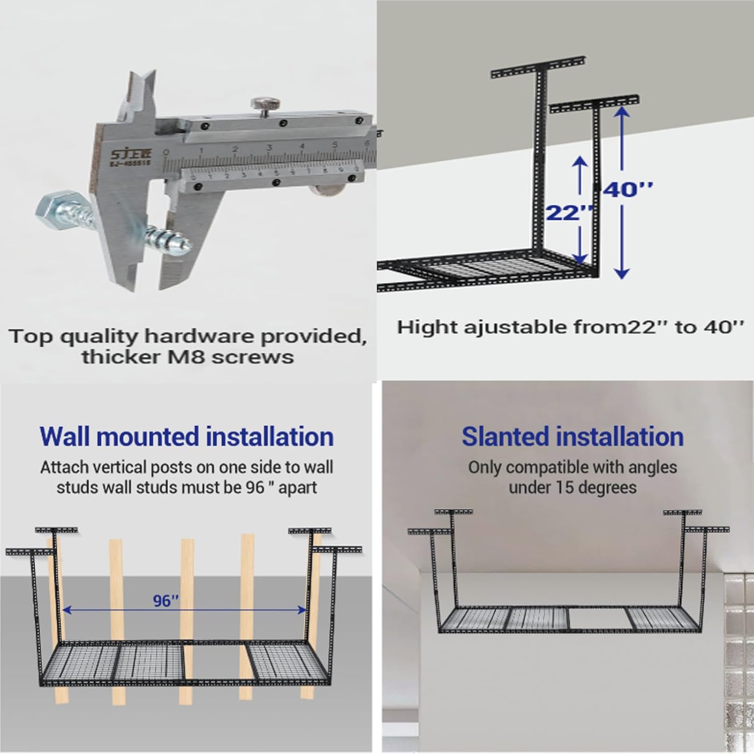 - Rust-Proof & Secure Installation: The scratch-resistant black finish resists rust and wipes clean effortlessly. Must be mounted to wood studs, joists, or concrete (drywall not supported). Designed for â€15° sloped ceilingsâfollow instructions for safe, wobble-free garage ceiling storage installation.