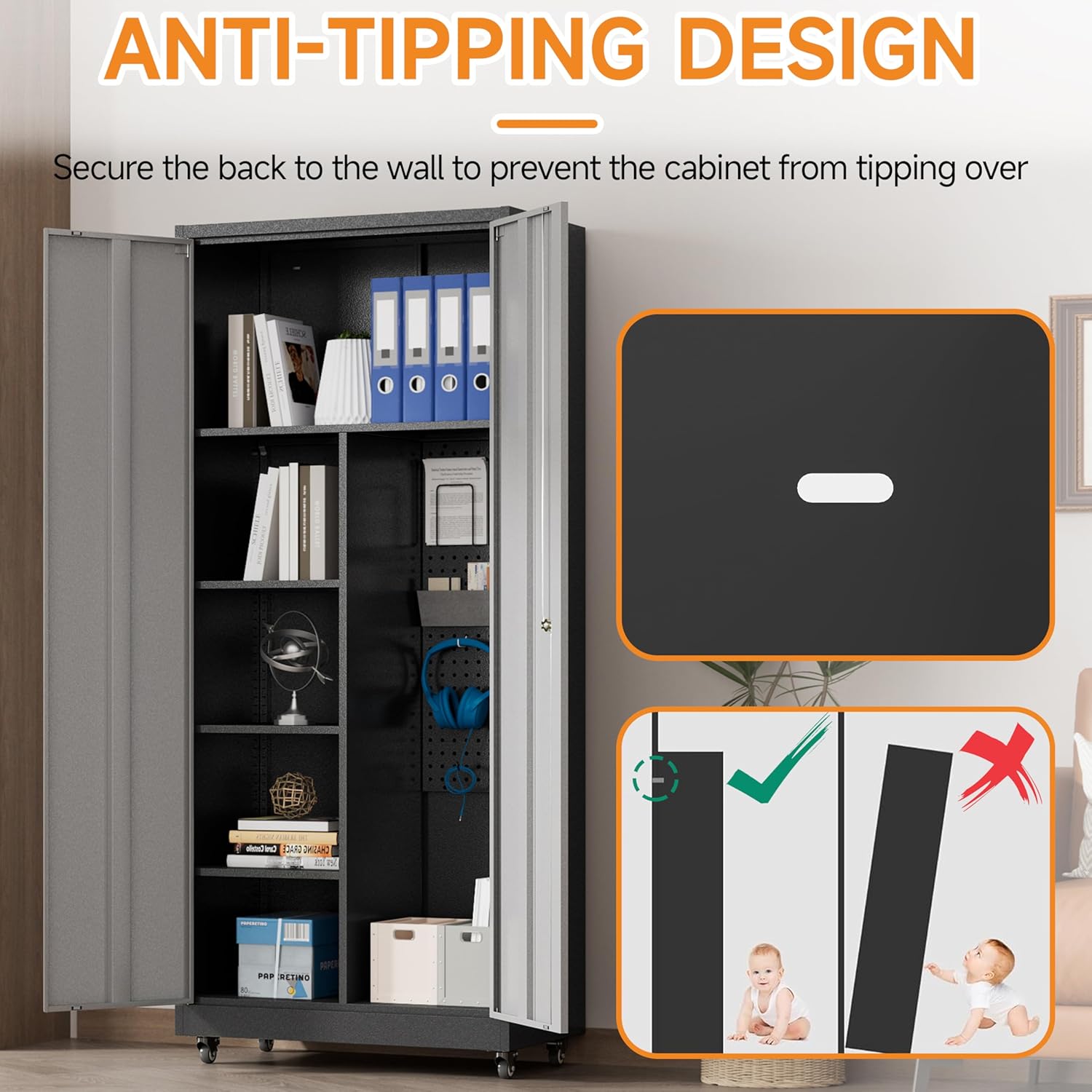 Metal Garage Storage Cabinet with 2 Doors, Adjustable Rolling Tool Storage Cabinet with Lock, 71" Steel Locking Tool Cabinet with Wheels and Shelves for Garage, Warehouse(Black&Gray, 71" H)
